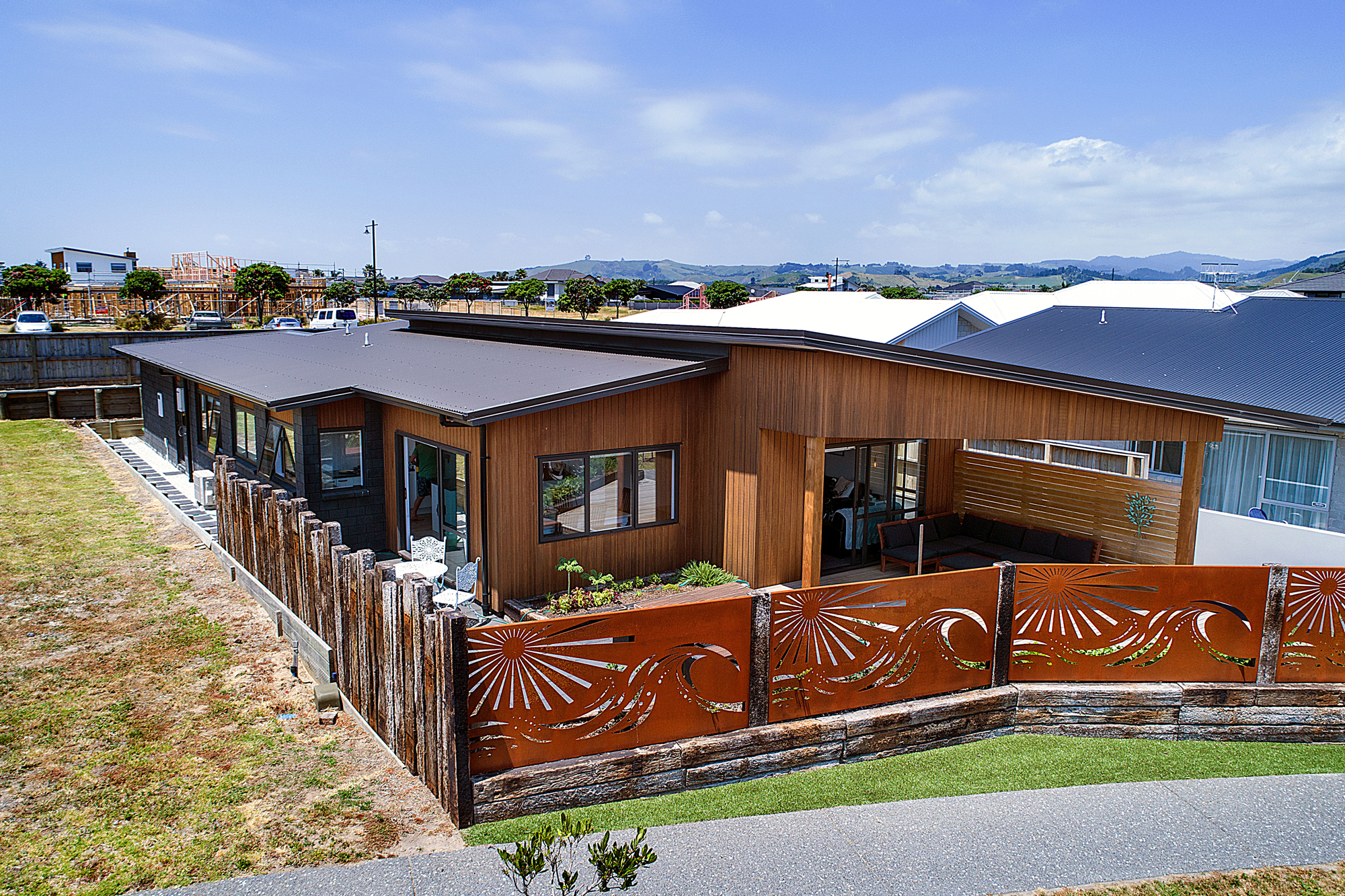 One of the features of this home is the vertical timber cladding, including hidden fixings. The earthy tones of the timber cladding tie in well with the timber deck and the fencing, making it right at home across from the beach!